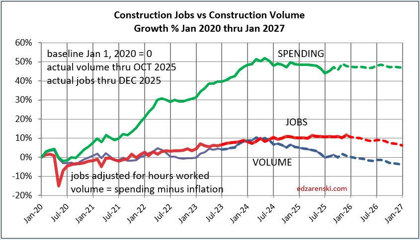 Construction Jobs increased 1.1% in 2025. Spending (actual thru Oct) fell 1.5% in 2025. But inflation ate up 4% of spending. So real volume of construction activity fell 5.3%. Therefore, productivity fell 6.4%.