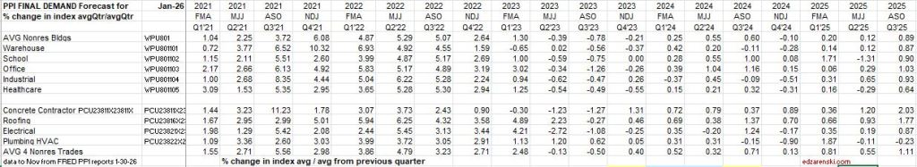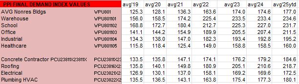 INPUTS thru Sept up ~2% from avg2024. Final Demand for Nonres Bldgs is up 1.2% ytd vs avg 2024. However, Oct is the revision month for Q3 Final Demand data, so Final Demand data not finalized for Q3.