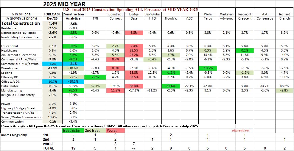 This is a simple list compiled of the percent growth forecast by each firm at Mid year 2025, then compared to the final outcome at year end. It’s a “How’d we do? comparison. The column titled Forecast’25 is the year-to-date spending through Dec. reported by Census 2-28-26, or in essence, the 1st look at final spending for 2025, the number all forecasters are trying to predict. There will still be minor revisions to this number.