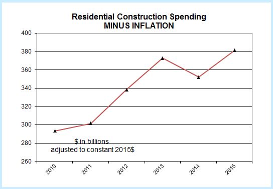 I’m sure there are other reasons to consider as this is not intended to be a complete list of what might cause variances between starts and spending, but it does highlight that starts does not give an exact indication of the growth in spending. There is a fairly consistent growth rate in starts of 20%/year and yet construction spending in current dollars has been growing at only 12.5%/year. Furthermore, a sizable portion of that spending growth is just for inflation. After inflation is taken out we see real construction volume in constant 2015$ has been growing at only 7%/year.