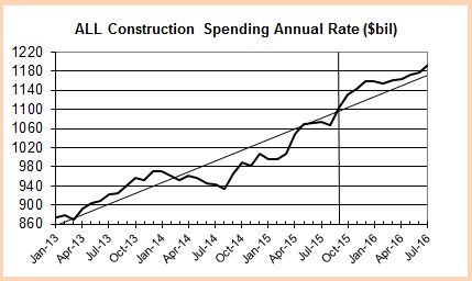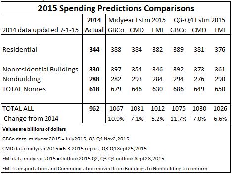 My numbers (GBCo) include the latest actual construction spending data released Nov. 2nd for September spending. This updated projection also includes revised future spending based on Dodge Data & Analytics construction starts released at the DDA Outlook 2016 conference Oct. 30th. My prediction for total spending in 2015, now at $1.075 trillion, hasn’t changed much (up 0.7%) since August. However, for next year my projection has increased from $1.150 to now expecting total spending of $1.190 trillion in 2016. The 2016 projection will be further refined in my year-end report.