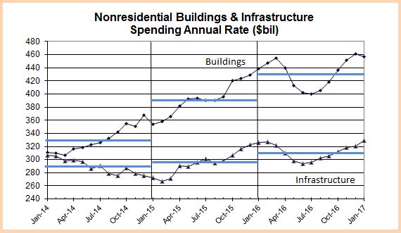 I often include a linear trend line in my plots because it’s good to be reminded of the long term direction and rate of growth rather than the monthly fluctuations. I’ve removed the trend lines from this plot to make a point. A fairly typical growth year shows spending finishing the year at a higher rate than when we started. The total spending for the year (shown by the horizontal bars) is the sum of the unadjusted monthly values, which is the same as the average of the monthly adjusted rates of spending. The plot above shows spending for buildings totals of $330 billion in 2014, $390 billion in 2015 and $430 billion in 2016.
