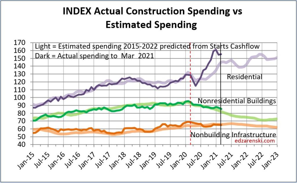 All of these indices do not correlate directly to construction spending. To forecast construction spending, a cash flow schedule of all construction starts must be prepared. In any given month, spending on construction includes some monthly portion of spending from all projects that started in all previous months but that have not yet reached completion. A cash flow schedule of all monthly construction starts is the best indicator that directly forecasts construction spending.