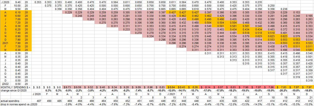 This table sets Feb 2020 starts to a baseline of 10.0. All other starts afterwards are entered at the percentage of actual $ starts that month compared to Feb 2020, so 8.30 in March of 2021 represents starts for Mar 2021 were 83% of Feb 2020. A lost start is negative spending. So, instead of thinking of the peak month of spending, that becomes the month of greatest loss. Those months near the middle of the schedule, are highlighted here.