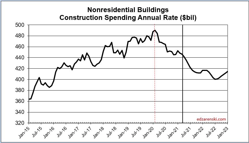 A simple model built to show when starts have maximum impact on spending indicates by Dec 2020 Nonres Bldgs construction spending put-in-place would be 10% lower than Q1 2020. Spending was actually 9% below Q1 2020. So the model seems to be on track.