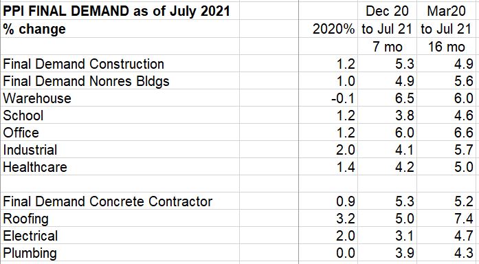 11-16-21 My current forecast for inflation in 2021 is now 6.5% for nonresidential buildings and 14% for residential. I expected to see some increase, just not this much. The PPI reports give the first clues to pass thru costs.