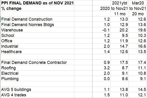 Current Final Demand pricing for Nonres Bldgs and Trades is highest on record. Prices support high inflation this year and next. Do not expect inflation to turn to deflation in 2022. The only time in 50 years that construction experienced deflation was in the period 2008 to 2011. At that time conditions were 10x worse than now.