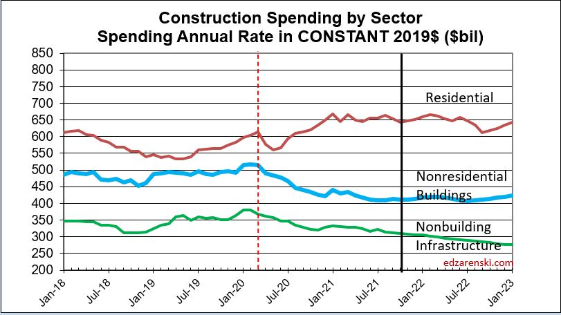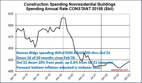 In constant (inflation adjusted) dollars, as of Oct. 2021, Nonres Bldgs spending is 20% below the Feb 2020 peak. The bottom is expected in mid-2022.