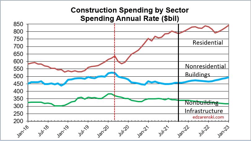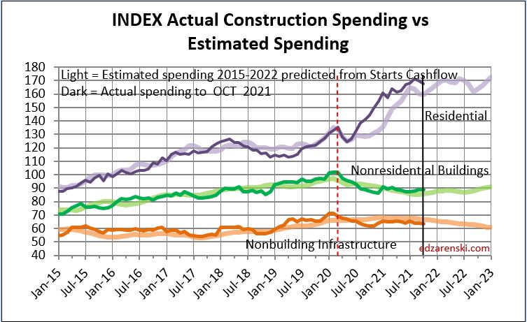 And finally, here’s one of the markers I use to check my forecast modeling, my forecasting performance tracking index. The light plot line is forecast predicted from my modeling. The dark plot line is actual construction spending. Even after any separation in the indices, the plots should move at the same slope. Almost without fail, the forecast model, estimated spending from cashflow, predicts the changes in direction of actual spending.