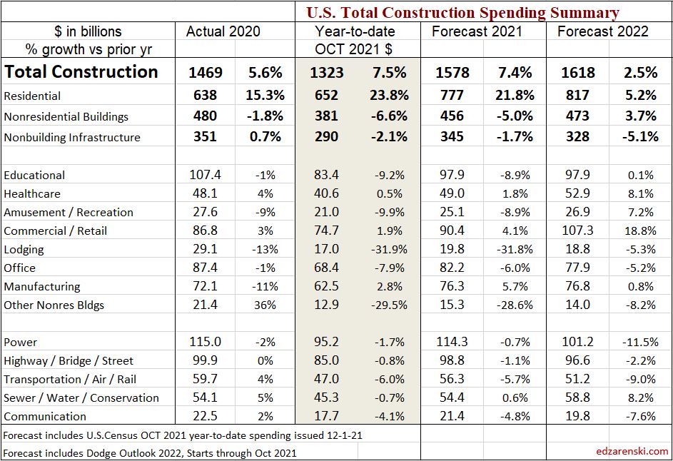 Spending Forecast for 2022 is expected to increase +2.5%. Residential spending for 2022 is forecast up +5%. Nonresidential Bldgs forecast is up +4%. Non-Bldg forecast is down -5%.