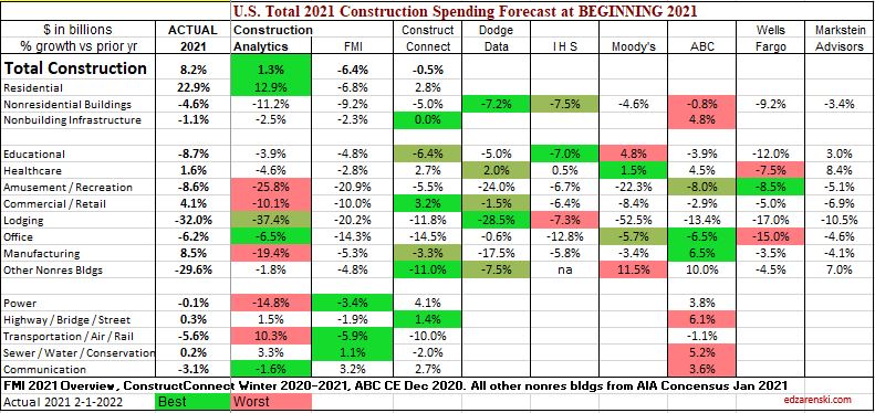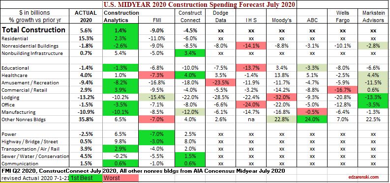 Construction Analytics (my forecast) didn’t fare so well in the 2021 Beginning of year forecast, but then did quite well in the Midyear forecast. My forecasts are based on cash flow of Dodge forecast of construction starts. When starts get revised, my forecast gets revised. Dodge revised the forecast of 2021 starts substantially after the beginning of the year, so that revised my forecast.