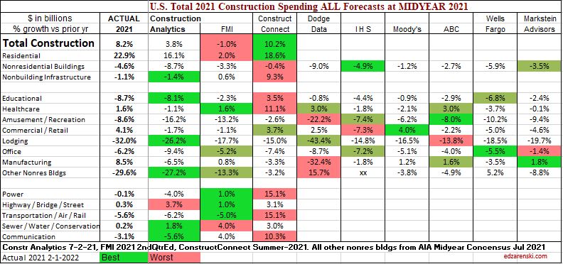 These colorful tables show the 2021 construction spending forecasts from 8 firms published in the January 2021 and July 2021 AIA Consensus Outlook. Construction Analytics (my forecast) Beginning year and Midyear forecasts are included for comparison. The actual spending year end published by U.S. Census on 2-1-22 is included. Forecast are highlighted in bright green (Best), dull green (2nd best) and red (worst).