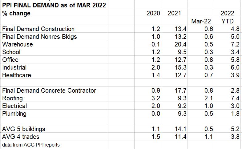 The PPI inputs through the 1st quarter is putting pressure on the nonres bldgs index for 2022 to move higher than forecast.