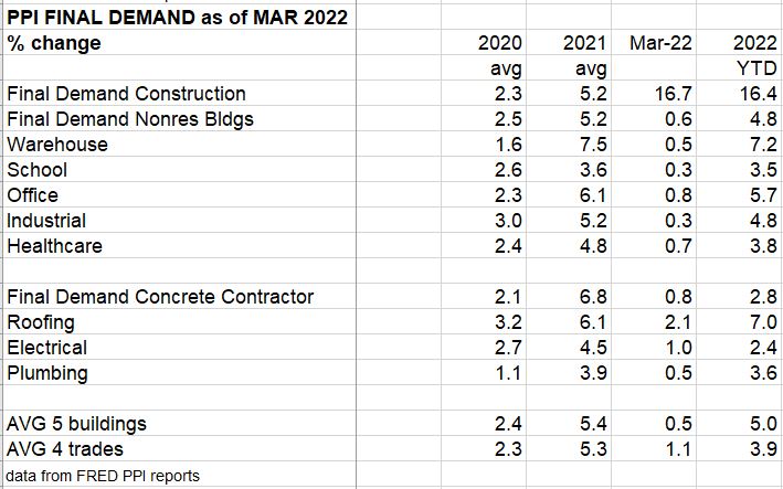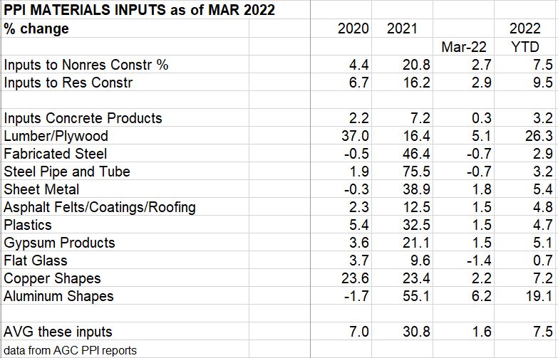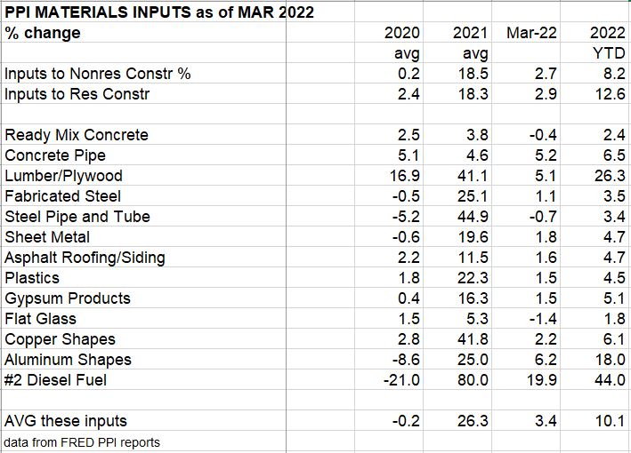 The only inputs reported here up more than 2% for March are Lumber/Plywood, up 5.1%, and Aluminum, up 6.2%. Year-to-date, for 3 months, Lumber/Plywood is up 26% and aluminum is up 19.1%. Watch copper, up 7.2% ytd, for potential world situation interfering with supply. Final costs of contractors and final cost of buildings changed very little in February or March. The final cost average of 5 building types is up 5.2% ytd in the first 3 months of 2022.