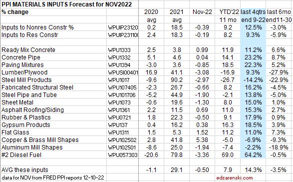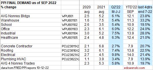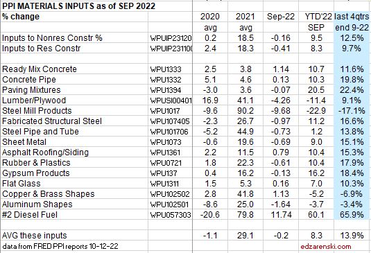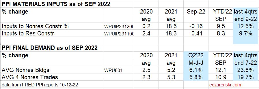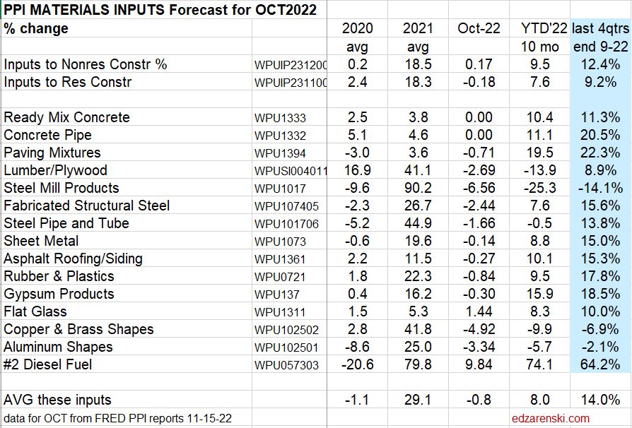 Construction PPI Data for Oct’22 > Inputs to Nonres Bldgs UP 9.5%ytd, 12.4% last4qtr. Inputs to Rsdn UP 7.6%ytd, 9.2% last4qtr