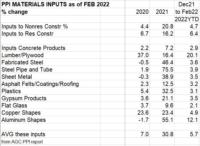 3-23-22 update Input Costs through February 2022 to nonresidential buildings up 4.5% year-to-date, residential up 6.4%. Inputs to residential went up 3.0% in Feb. In a typical year of 4% inflation, costs would increase only 0.25% to 0.50% per month. Residential is up 6%+ after the first two months! Most of the inputs reported here are up less than 2% for February, except Lumber/Plywood up 4.1% and Aluminum up 6.2%. Year-to-date, for two months, Lumber/Plywood is up 20% and aluminum is up 12.1%. Watch copper, up 4.9% ytd, for potential world situation interfering with supply. Final costs of contractors and final cost of buildings changed very little in February. Range is mostly up 2% to 4% ytd, but up to 6% year-to-date. 4-12-22 edited, corrections.