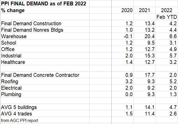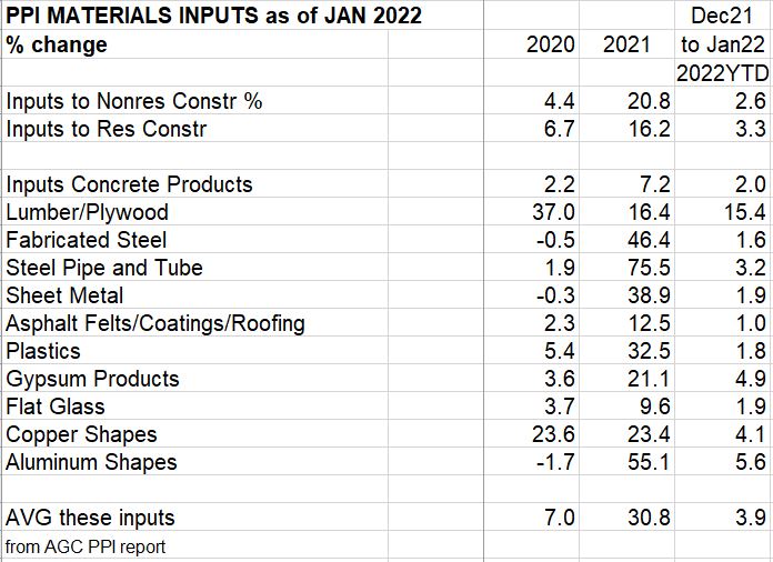 January Inputs PPI is up 2.6% in nonresidential and 3.3% for residential. Most of the inputs reported here are up less than 2% YTD, but Lumber/Plywood is up 15%. Final costs of contractors is up 1% to 5% and final cost of buildings is up 3% to 6%. SEE also Construction Inflation 2022