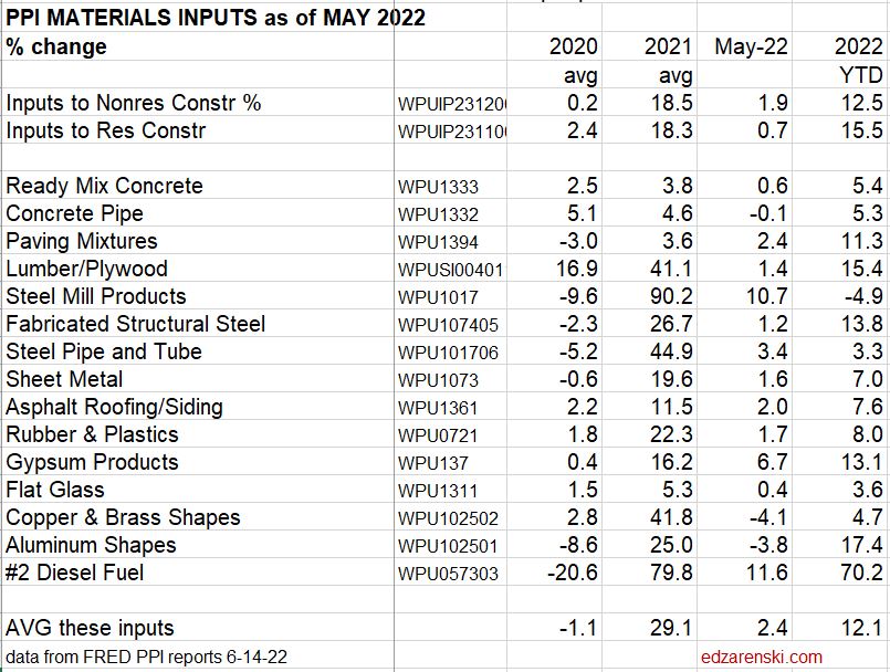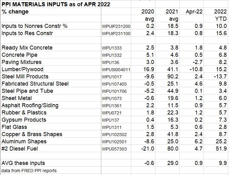 May PPI data for construction > Big gainers from 2021 have slowed in 2022, Lumber, Steel, Sheet Metal, Rubber/Plastics, Copper. New gainers in 2022 are Ready Mix Conc, Conc Pipe, Paving Mixtures, Gypsum. We could see the same levels of inflation as last year, just from different products.