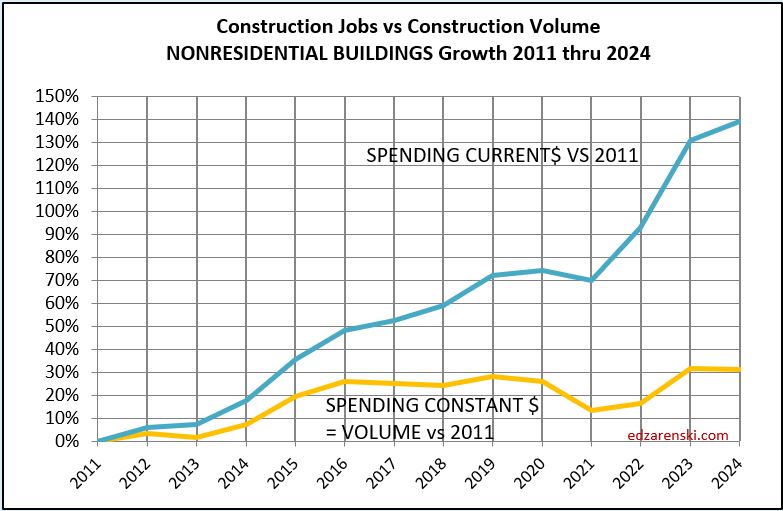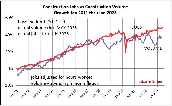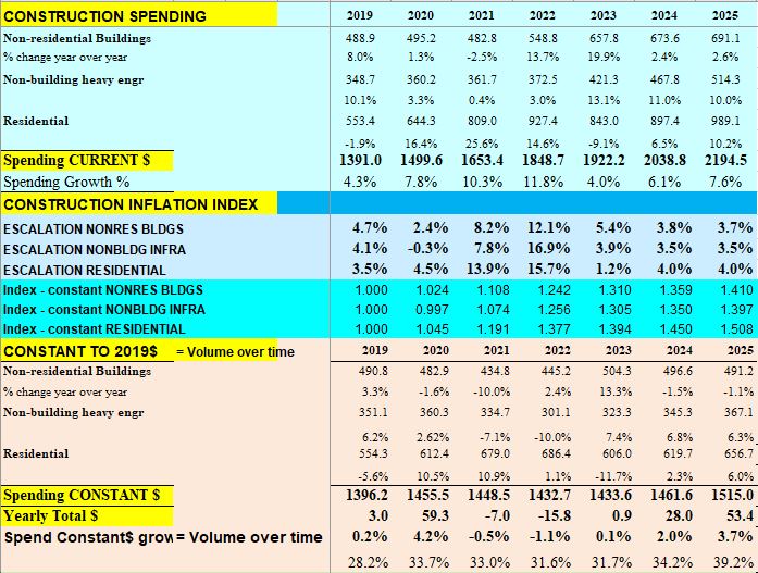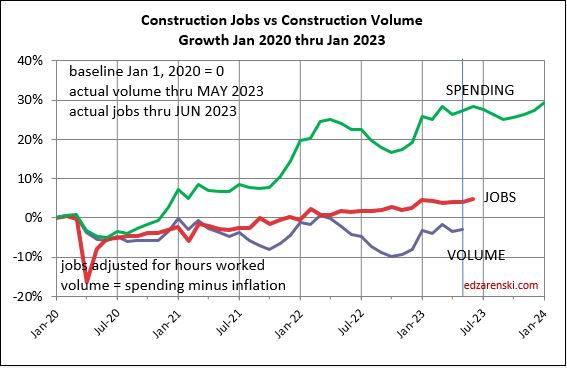Construction spending, particularly nonresidential buildings, stalls for the 2nd half of 2023. Spending is up/dn thru year end, ending the year about where it is now. But by year-end, after taking out inflation, volume will be down 2%. In last 3 yrs, jobs seldom drop along with volume. I think jobs will not track volume down 2%, but finish 2023 about where they are now.