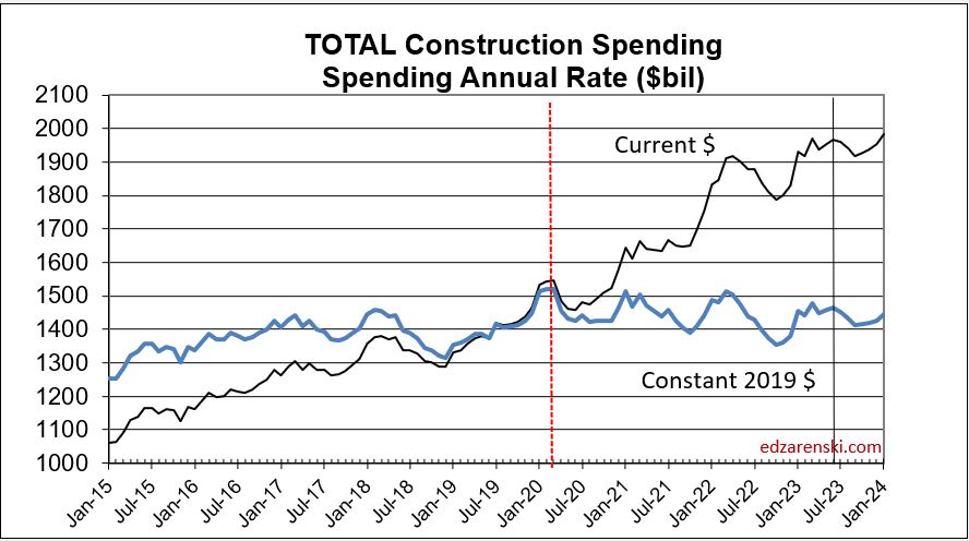 Construction Spending since Feb 2020 has increased (monthly SAAR Current $) $425bil, up 28%. But inflation increased $480bil (32%). Actual volume of work has decreased 3.5% or $55bil (monthly SAAR Constant 2019 $) since Feb 2020. The big decline in constant $ in 2020 and in 2021 is nonresidential buildings. The big decline in 2022 is residential.
