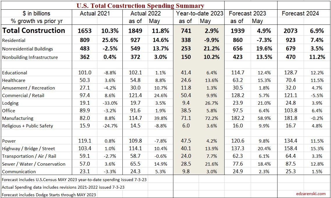 When Census released May construction spending data on July 3 they also revised spending for all markets for the last 2 years. Largest revisions are usually in previous year. This changes % growth and baseline for the start of 2023.