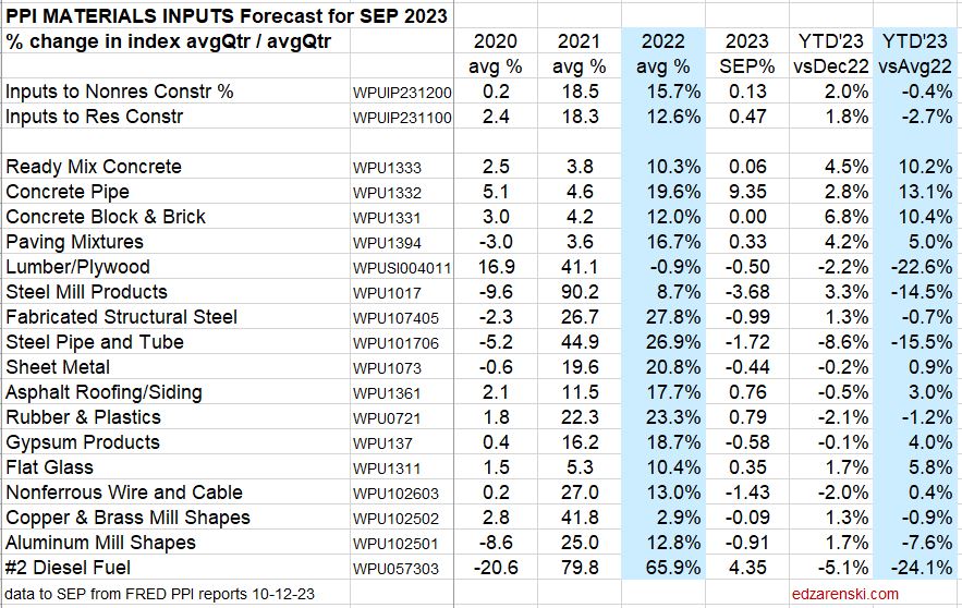 The last column, YTD vs 2022avg, gives an indication of 2023 avg if current YTD costs remain constant for the remainder of the year. However, Inputs to Nonres Bldgs has been down 3 of last 4 qtrs. Res has been down 4 of last 5 qtrs. So it’s likely we will see some more downward pressure in the indices.