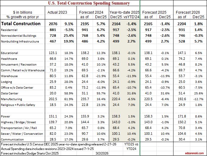 First pass at forecast 2026, includes first Census report of final 2025 spending. 2025 will be revised several times in the coming months, Dec and Nov are still subject to revision. All of this is behind what would be normal schedule due to shutdowns. Then all of 2025 will be revised, often a more significant revision, with the release of May data on July 1. However, this represents my initial Outlook for 2026 spending. More to soon follow on jobs and inflation.