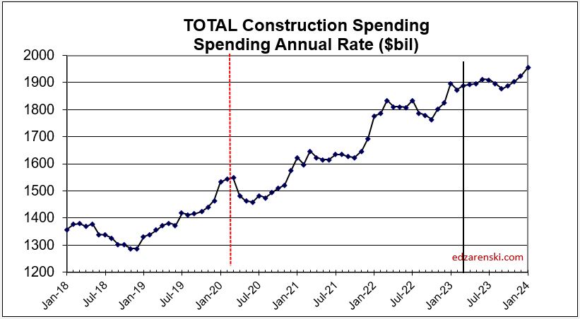 For the 4yr period 2021 thru 2024, jobs are up 13%, but volume of work put-in-place is up only 6%.