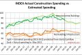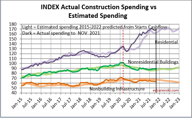And finally, here’s one of the markers I use to check my forecast modeling, my forecasting performance tracking index. The light plot line is forecast predicted from my modeling. The dark plot line is actual construction spending. Even after any separation in the indices, the plots should move at the same slope. Almost without fail, the forecast model, estimated spending from cashflow, predicts the changes in direction of actual spending.