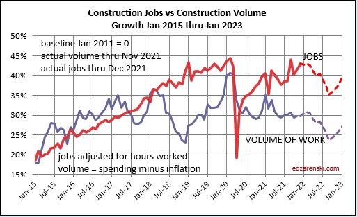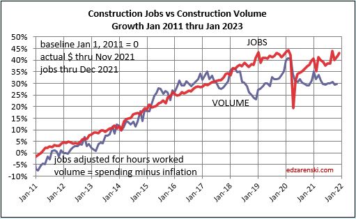 Of concern is that since Feb 2020, total construction volume has recovered to a point that is down 7%, but jobs have increased back to a level that is down only 3%. Jobs are increasing at a rate that is closer to the growth in construction spending, which is substantially greater than the rate of growth of construction volume.