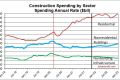 The Total Construction Spending plot doesn’t show enough detail. As described above, more detail is needed to understand what is going on. The sector plot below shows residential up and nonresidential down..