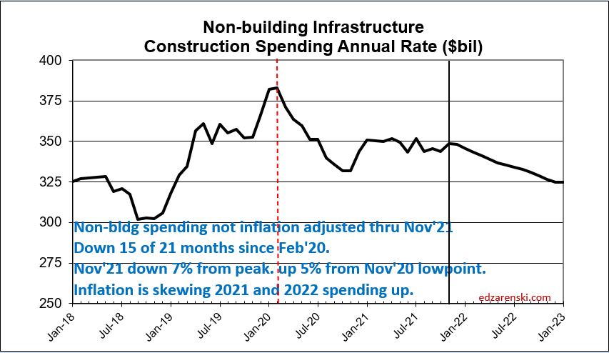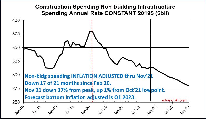 Below is the Non-building plot, inflation adjusted. Both these plots show there has been no increase since Feb 2020 in volume of nonresidential or non-building work to support jobs growth, and there is little to no help in 2022.