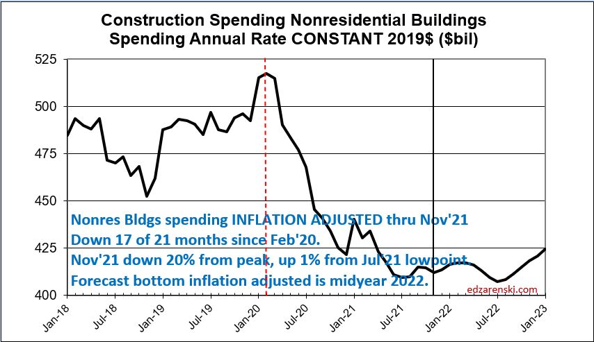 In constant (inflation adjusted) dollars, as of Nov. 2021, Nonres Bldgs spending is 20% below the Feb 2020 peak. The bottom is expected in mid-2022.