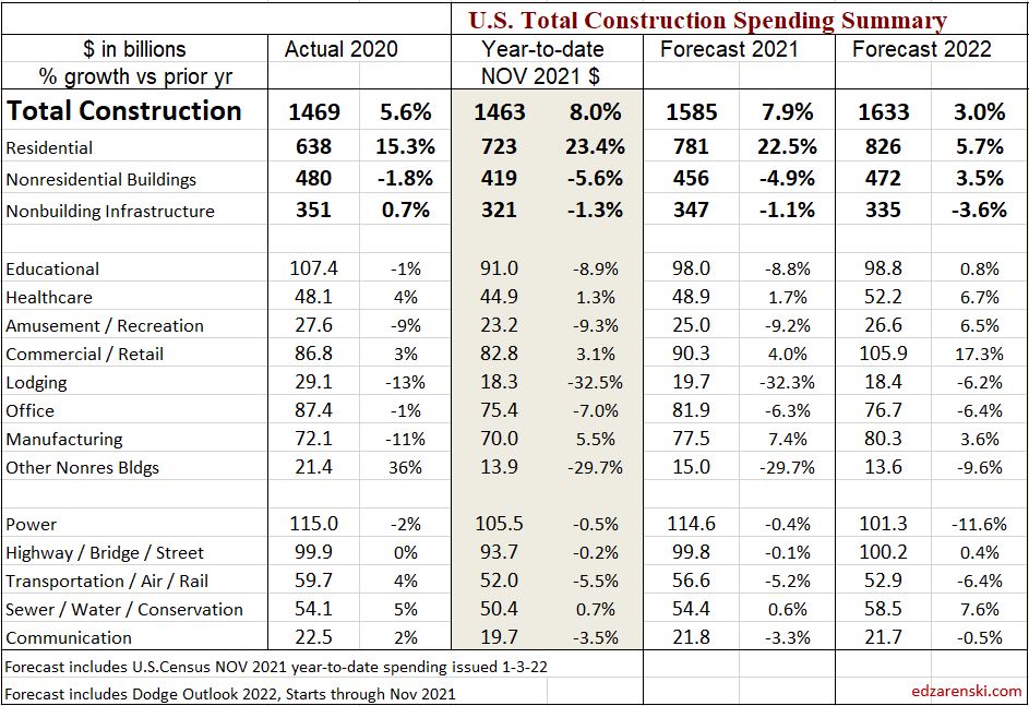 Spending Forecast for 2022 is expected to increase +3.0%. Residential spending for 2022 is forecast up +5.7%. Nonresidential Bldgs forecast is up +3.5%. Non-Bldg forecast is down -3.6%.