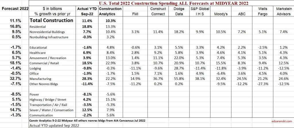 In the AIA Midyear 2022 Consensus, eight firms provided forecasts for Nonresidential Bldgs markets construction spending for 2022. Their forecasts for 2022 are summarized here, percent +/- growth. Construction Analytics midyear forecast is included for comparison. Who is closest, who’s not? The year-to-date (YTD) value is through September 2022. I’ll update after final spending for 2022 is posted in Feb. 2023, and then revised in July. The Sept YTD data was released Nov.1st. I’ve included my current (Nov) forecast for 2022 final spending, the eventual target of all these forecasts, to the left of the table.