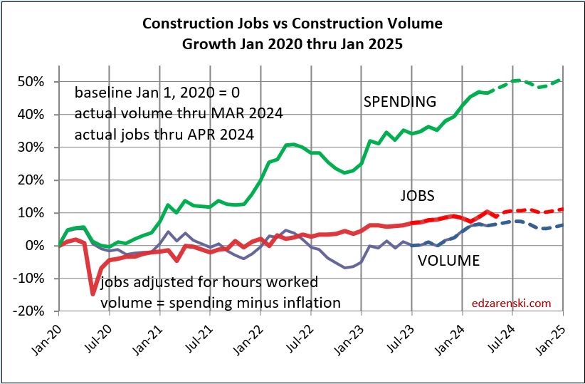 Construction spending in 2024 will hit near $2.15 trillion, another new high, up 50%+ since 2019. (The last time constr spending declined was 2011. Construction volume, (spending minus inflation) will finish the year up only 10% since 2019.