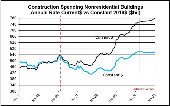 My construction spending forecast for 2025 Nonres Bldgs is only an annual gain of 2%. Low growth is driven by projects ending in Manufacturing and Warehouse. In the last 3 yrs, there were $230bil Mnfg starts, most in 2022, $130bil above normal, now some are ending. Without Manufacturing, Nonres Bldgs 2025 spending would be up 6%. So while outward appearance may be that Nonres spending is declining, in large part it is due to mega spending on Manufacturing buildings (and Warehouse) tapering down upon completion, creating very large annual declines, but normal. See The Manufacturing Spending Taper