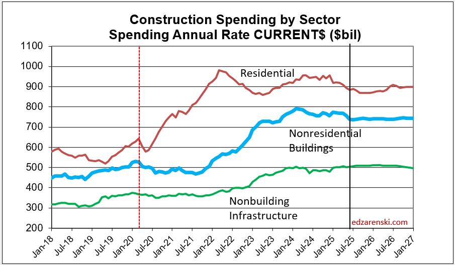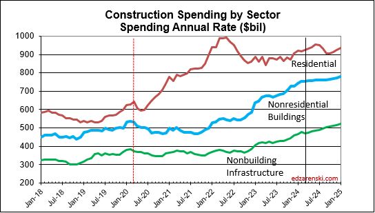 Residential current rate of spending is a bit less than 2% above the 2024 average. Growth of 1%/mo will occur in the 1st half 2025, then reverse to a slight decline in the 2nd half.