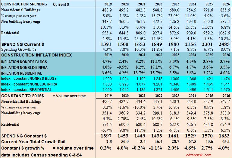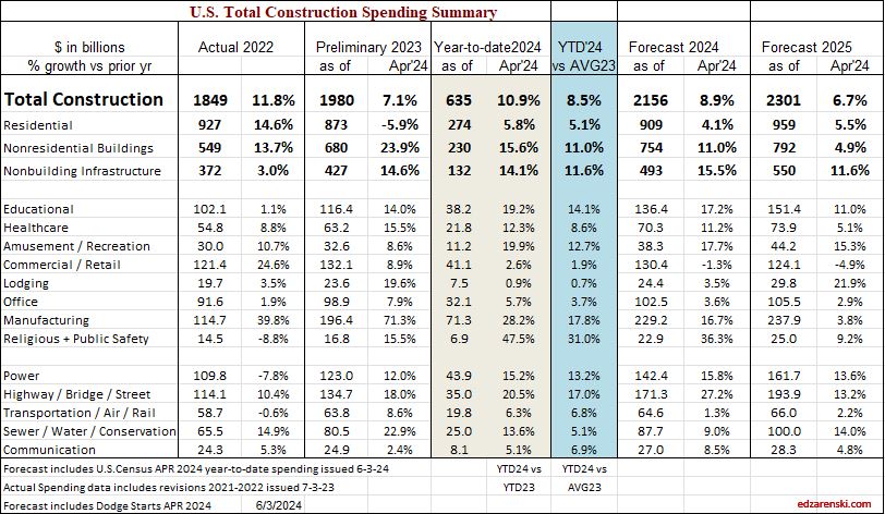 Total construction spending for 2024 is forecast up 9%, down slightly since last update. Residential was reduced, expect now only +4%. Nothing else changed much. Nonres Bldgs forecast up 11%. Nonbuilding up 15%.