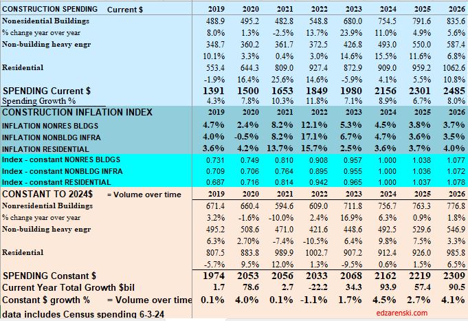Although nonres bldgs starts fell 18% in 2020 and residential starts fell 11% in 2023, neither led to a devastating drop in spending as recovery occurred quickly. There is nothing in the current outlook to indicate recession, on any horizon. This forecast does not anticipate a recession.