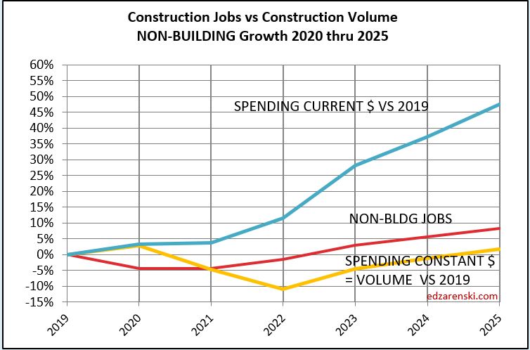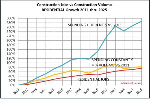 The above plot is taken from this 2011-2025 plot below. Looking back to 2011 shows how consistent jobs and volume growth was from 2011 thru 2019. This plot shows Construction Jobs growth since mid-2020 occurring at the same slope (rate of growth) as 2011-2019. Construction jobs grow avg 3.5%/year, even if volume growth varies. The Pandemic set jobs growth back by almost 2 years.
