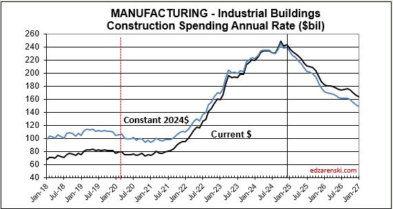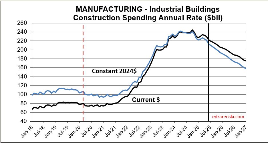 The decline in Manufacturing construction spending is due to having passed the peak in the scheduled project timelines for the large volume of mega-projects that started in 2021-22-23-24. (I wrote about it in more detail in Nov’24 in the article linked.) Peak spending is typically just past the midpoint of project construction. From Apr 2024 to Nov 2024, Mnfg spending averaged $240bil., the highest rate of spending on record. In 2025 it started the year at a rate of $$230bil but will end the year at $210bil. By the end of 2026 the rate of spending drops to $190bil.