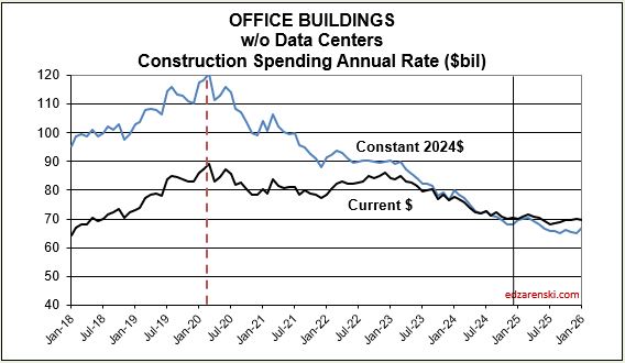 Biggest forecast declines in Current$ construction spending: Residential -5.8% (by far largest $ decline, -$55bil); Manufacturing – 6.5%, -$15bil; Warehouse -10%, -$7bil; Office (ex Data Centers) -10%, -$7bil; Comm Retail (ex Warehouse) -8%, -$6bil.