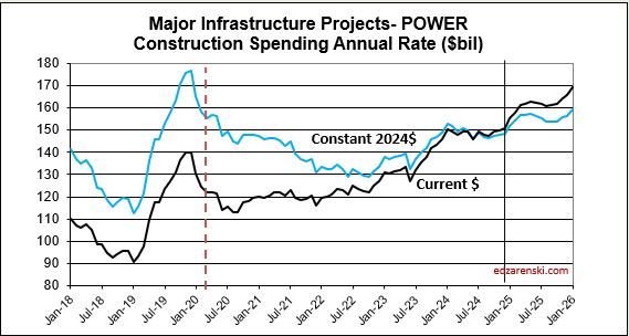 Power SAAR rate of spending begins 2025 2.0% higher than the average for 2024. Starts are up 22% over the last 2 years. 2024 spending finished level with where it started and begins 2025 up 2% over avg. 2024. The rate of spending starts strong at 2%/mo in Q1, then falls back to 0.3%/mo for the remainder of 2025. My forecast is for 8.5% spending growth in 2025.