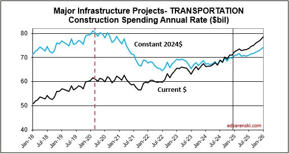 The same effect on spending by the tapering off of Manufacturing Bldgs ending will happen in Infrastructure spending due to the current increases in Highway/Bridge, only ending a few years later.