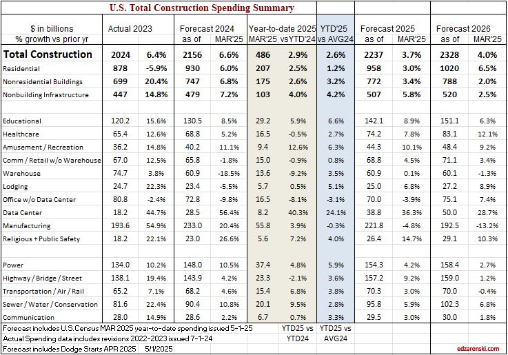 The total construction spending forecast, now at $2,237bil, +3.7% vs. 2024, has been lowered a bit since the Outlook in Feb. ($2,272bil, +5.5%). Most of the reduction is in Residential, from $997bil, +7.2% down to $958bil, +3.0%. Nonres Bldgs was reduced by $11bil and Nonbldg increased by $7bil. Compared to the average for the year 2024, current total spending YTD is up 2.6%, but is expected to pick a little up throughout the year across all sectors.