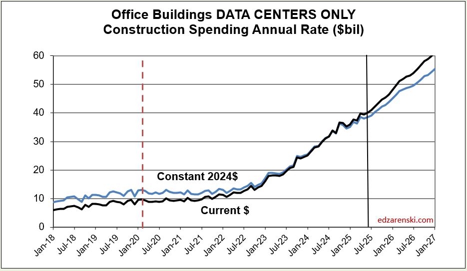 However, Data Center spending is already up 16% in Oct-Nov-Dec vs the average of 2024, so begins 2025 on a high note, up 16% from 2024. Data Center spending increased 45% in 2023 and 56% in 2024. With spending increasing at an average 3%+ per month in 2024, and starting out at that pace in 2025, it’s easy to predict Data Center spending may reach 40% growth for 2025.
