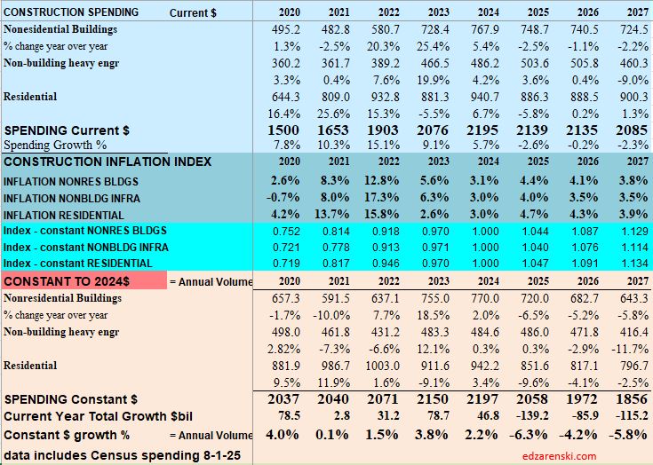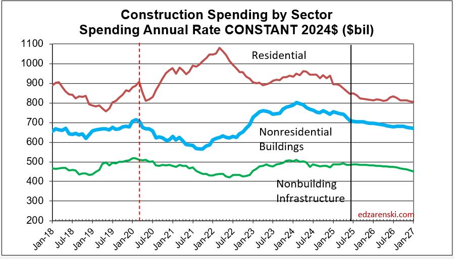 Environment for construction jobs looking difficult. Constant $ spending in 2026 is down just less than 1%. But Volume of work (spending minus inflation) available is down just over 4% and is declining all through 2026. Biggest declines by far, Manufacturing and SF Rsdn.