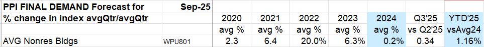 INPUTS thru Sept up ~2% from avg2024. Final Demand for Nonres Bldgs is up 1.2% ytd vs avg 2024. However, Oct is the revision month for Q3 Final Demand data, so Final Demand data not finalized for Q3.
