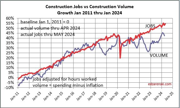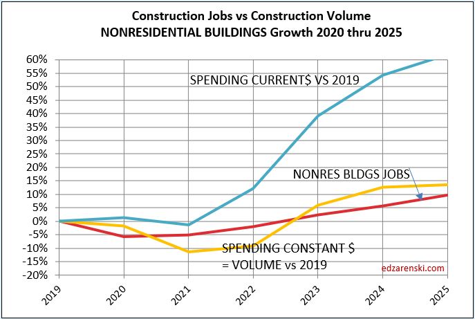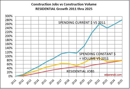 The above plot is taken from this 2011-2025 plot below. Looking back to 2011 shows how consistent jobs and volume growth was from 2011 thru 2019. This plot shows Construction Jobs growth since mid-2020 occurring at the same slope (rate of growth) as 2011-2019. Construction jobs grow avg 3.5%/year, even if volume growth varies. The Pandemic set jobs growth back by almost 2 years.